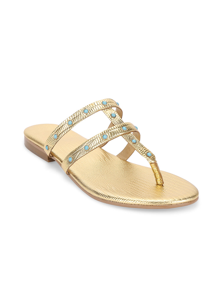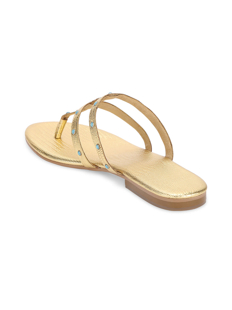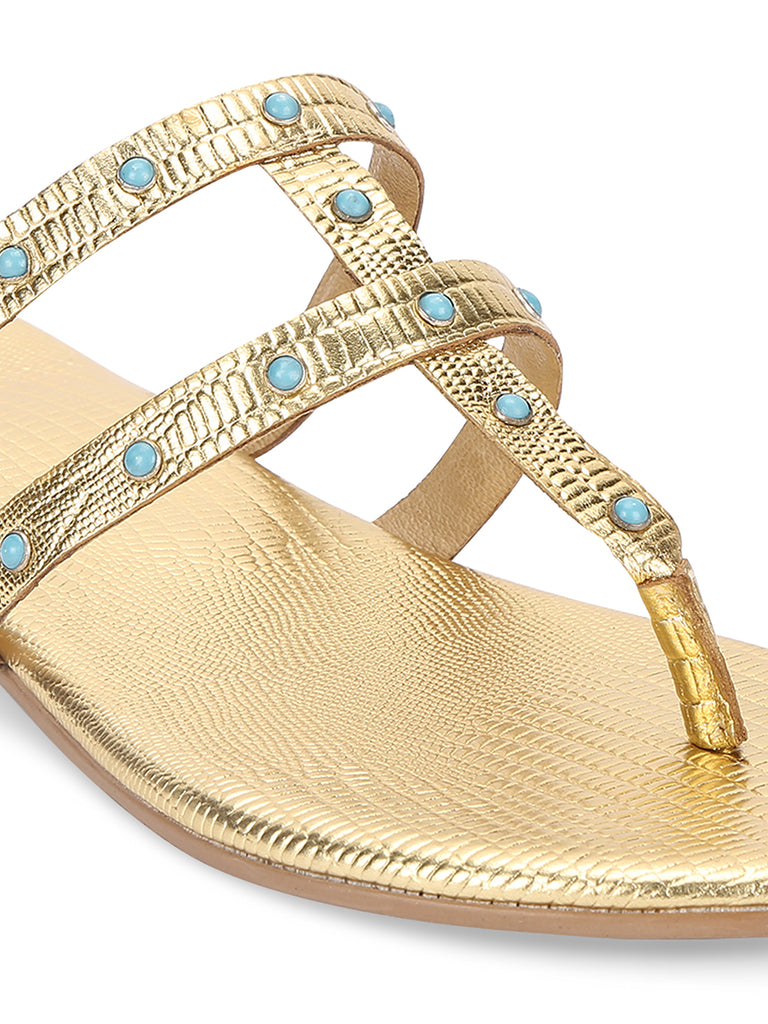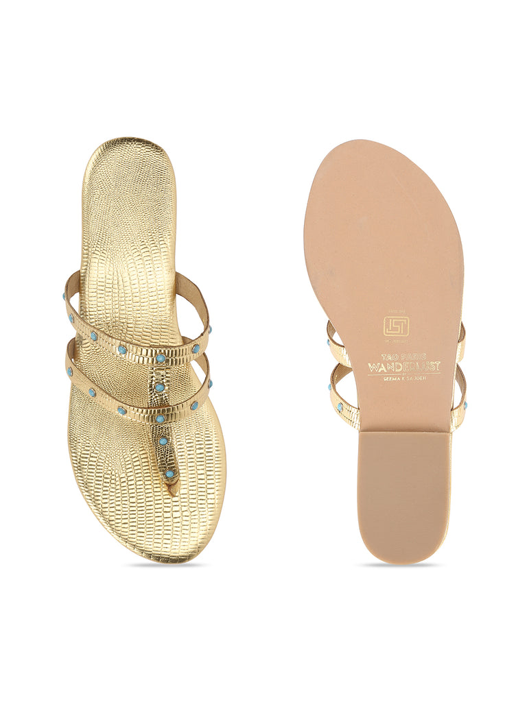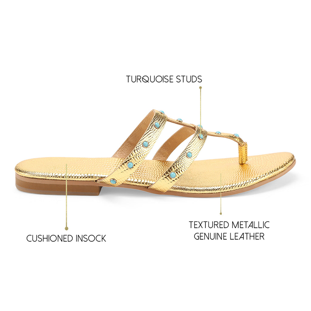 Elevate your wardrobe with our Gold Metallic Genuine Leather Footwear, adorned with striking turquoise studs and featuring a cushioned insock for all-day comfort. Designed by celebrity fashion designer Seema K Sajdeh, this collection offers a blend of sophistication and durability, supported by a 3-month warranty.