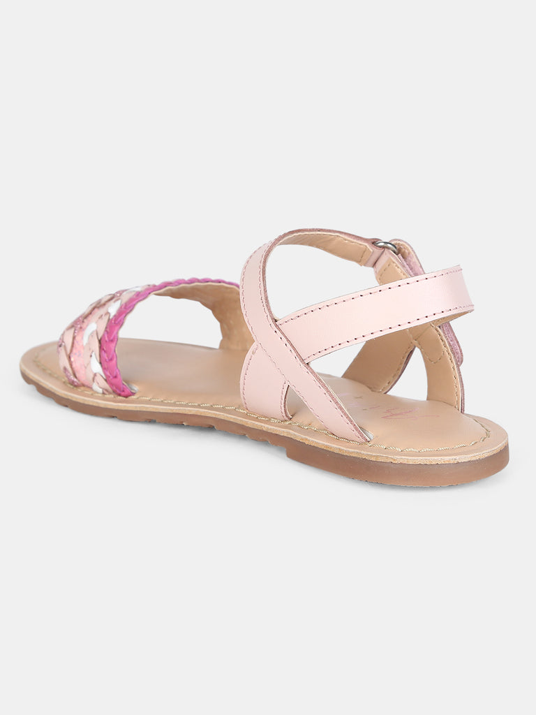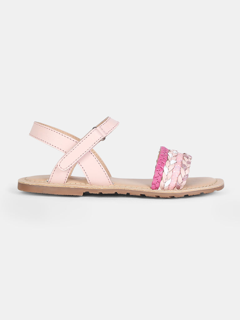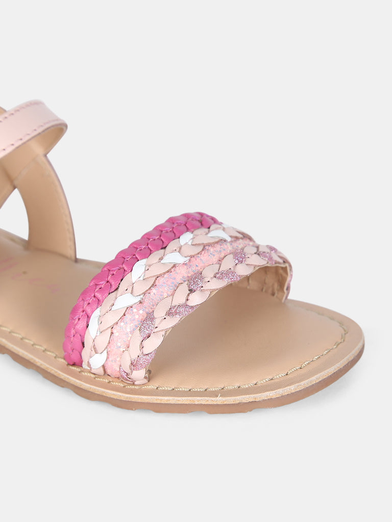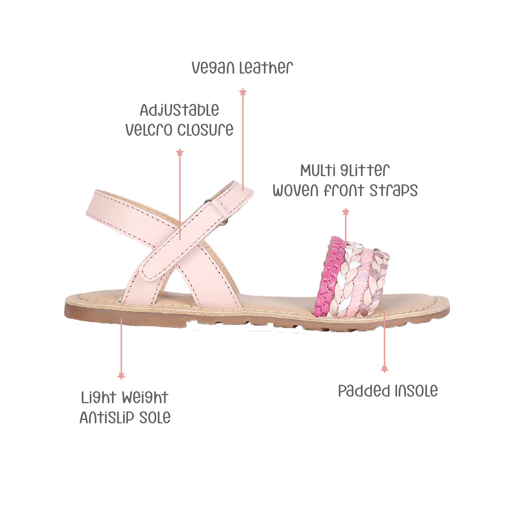 Kids Leather Sandals with braided and glitter stripe uppers, a Velcro back strap, cushioned insole, and anti-slip TPR sole for stylish comfort.