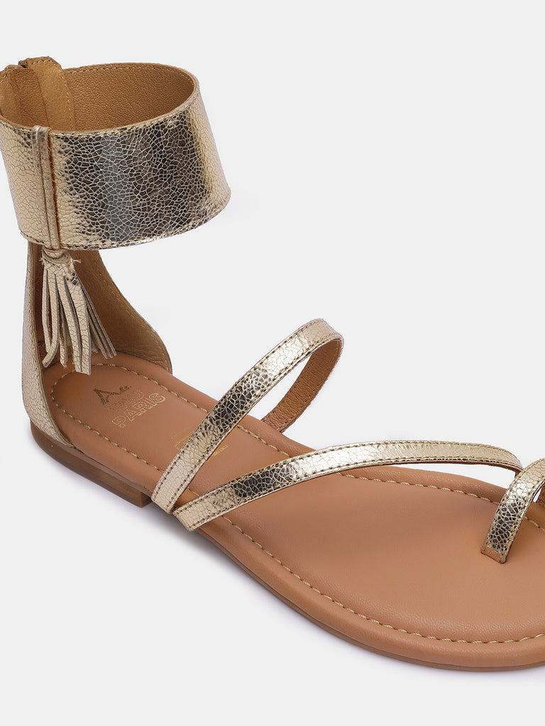 Make a bold statement with the Tao Paris Women's Metallic Gladiator Flat Sandals. These trend-forward flats feature a metallic gold finish with sleek toe and midfoot straps, and a striking wide ankle cuff with a playful tassel detail that adds a touch of drama to every step.