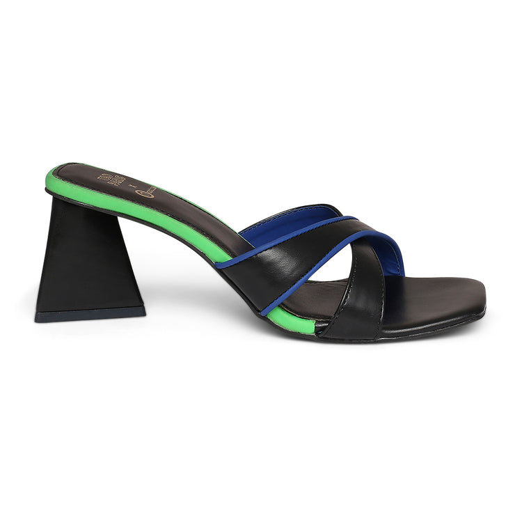 Bold and chic, our Black Block Heels feature vibrant blue and green piping for a modern twist. The sturdy block heel ensures both style and comfort for any occasion.