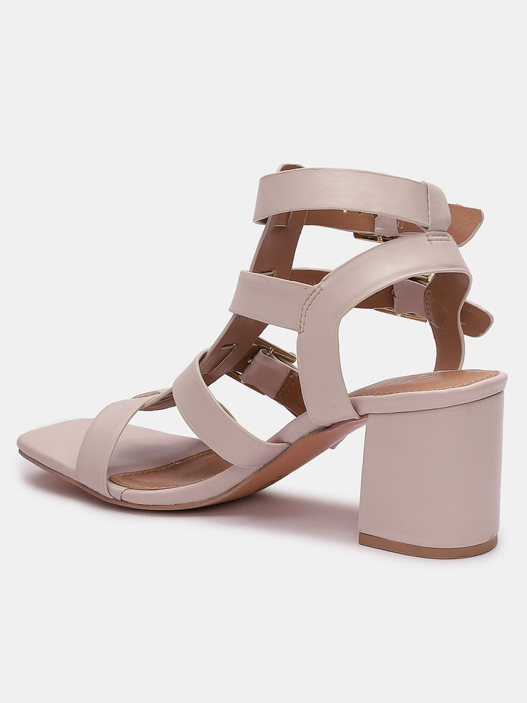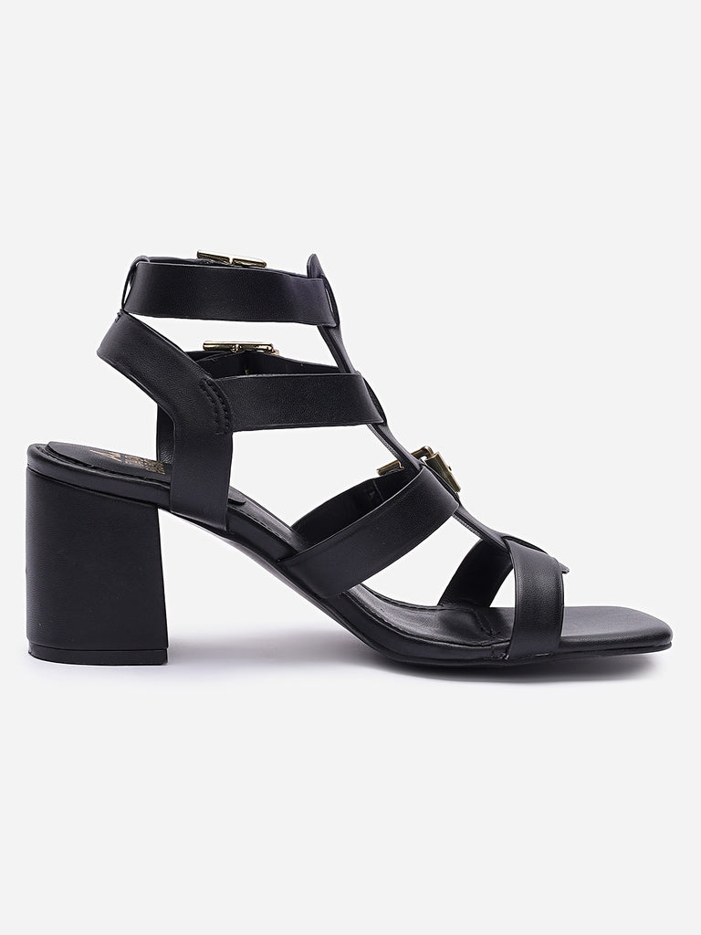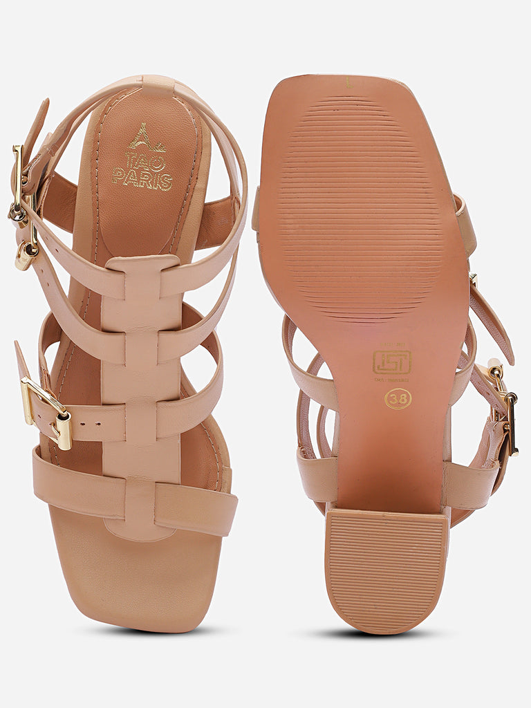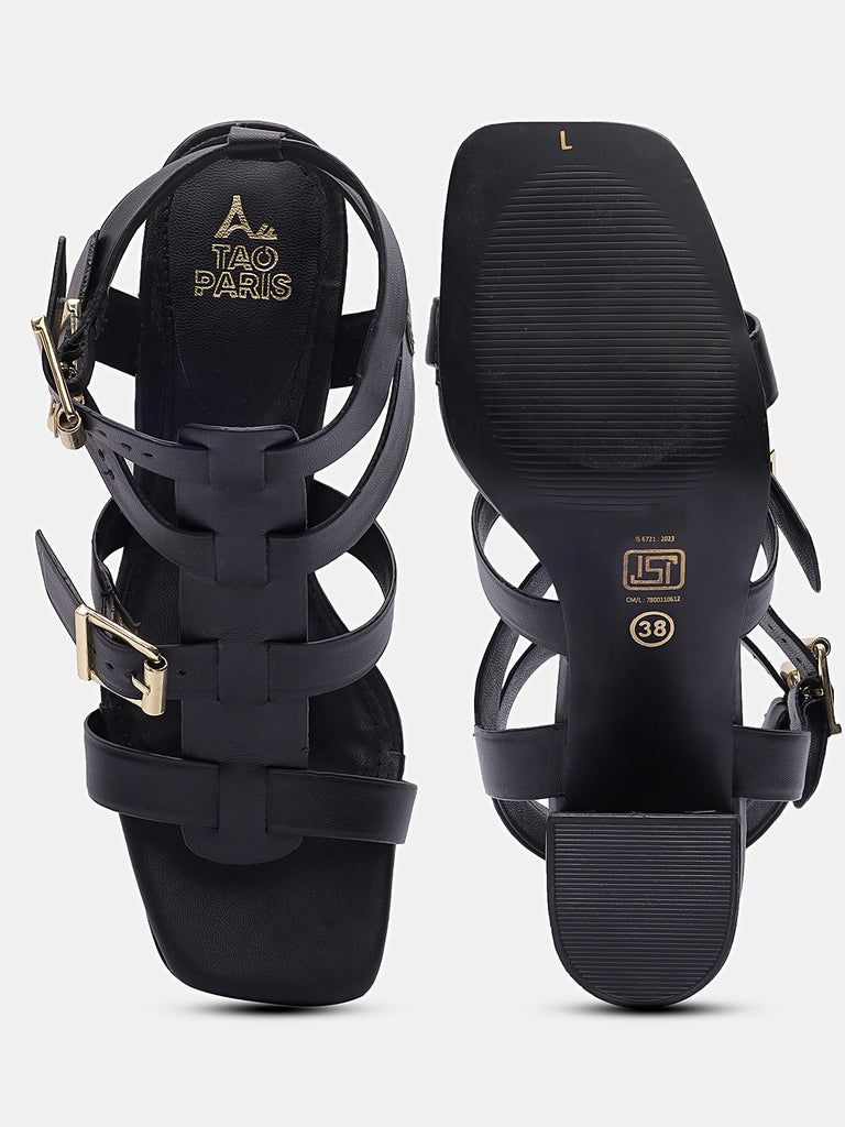 Channel bold sophistication with this pair of Black / Beige multi-buckle block heel sandals from Tao Paris. Crafted in premium vegan leather, these fashion-forward sandals feature a strappy silhouette adorned with statement gold-toned buckle detailing. Designed with a sturdy block heel and square toe front, they offer both comfort and edgy elegance. The secure fit and versatile style make them perfect for party nights, fashion-forward brunches, or standout streetwear.