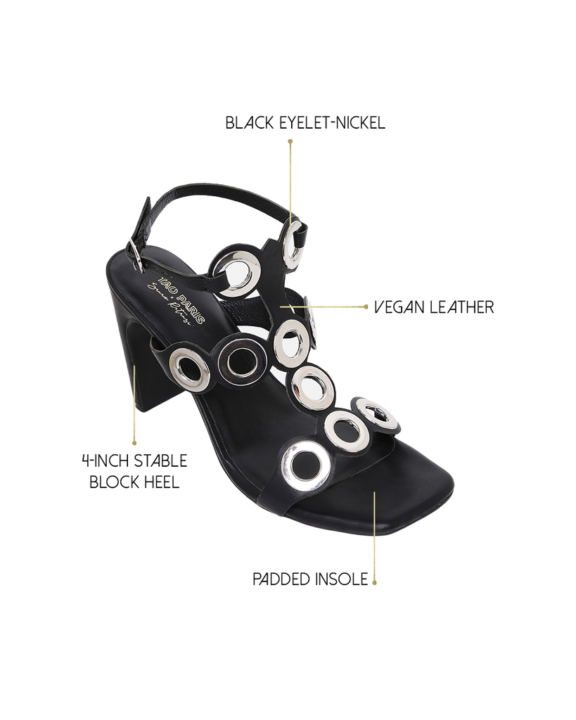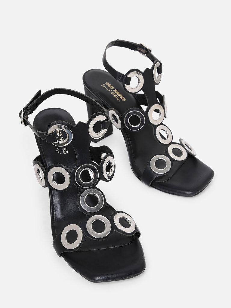 Keywords: black block heel sandals, statement heels for women, metallic eyelet heels, Tao Paris footwear, high heel party shoes, edgy women’s heels, bold black heels, fashionable sandals for women