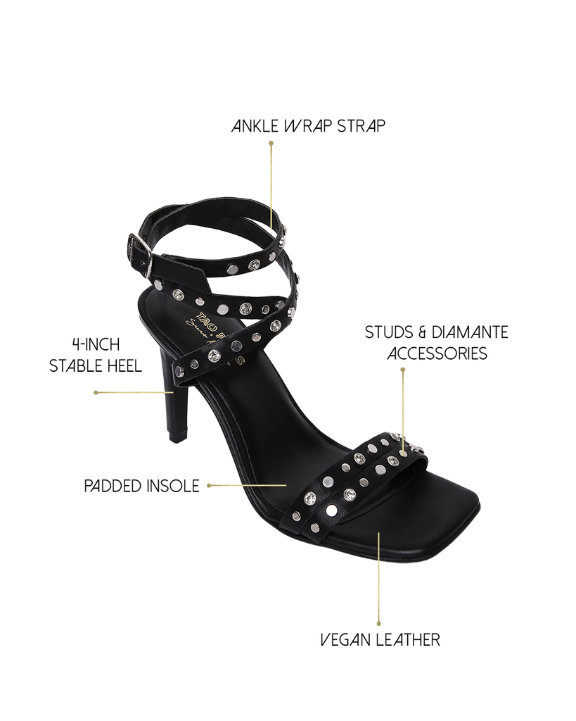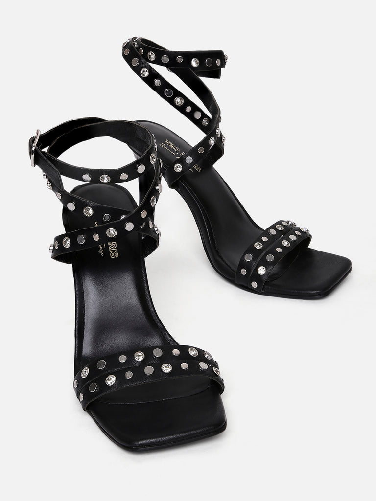Bring out your bold side with the Tao Paris Black Studded Heels – where edgy elegance meets everyday chic. Featuring metallic stud accents on a sleek black silhouette, these ankle-strap sandals are the perfect mix of rockstar attitude and refined fashion. The square toe and medium-high heel offer a modern touch while ensuring all-day comfort.