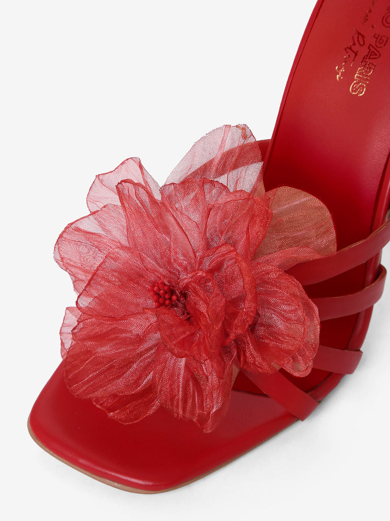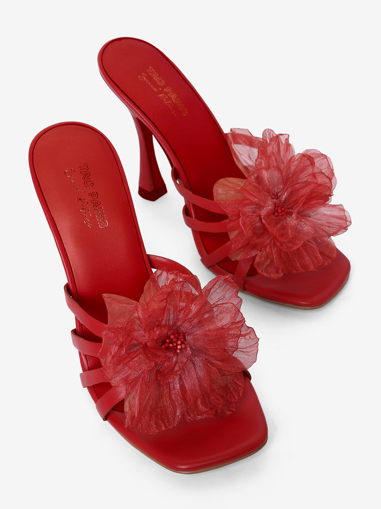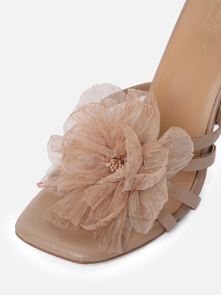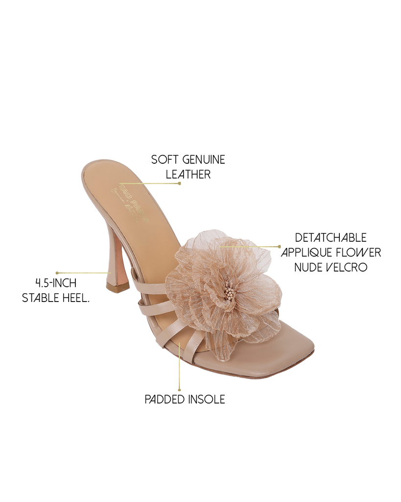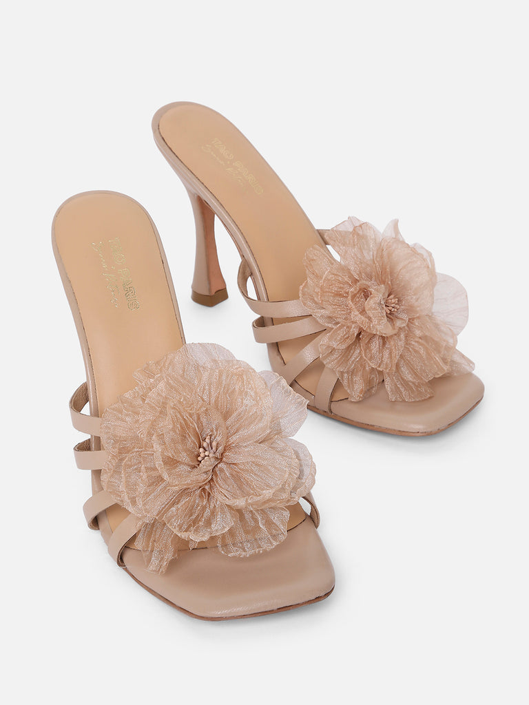 Add a touch of romance to your wardrobe with the Tao Paris Nude Mule Heels, adorned with a soft, oversized organza flower. These elegant slip-on heels feature sleek multi-strap detailing, a graceful flared heel, and a square toe silhouette—blending modern sophistication with delicate charm.