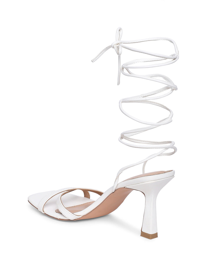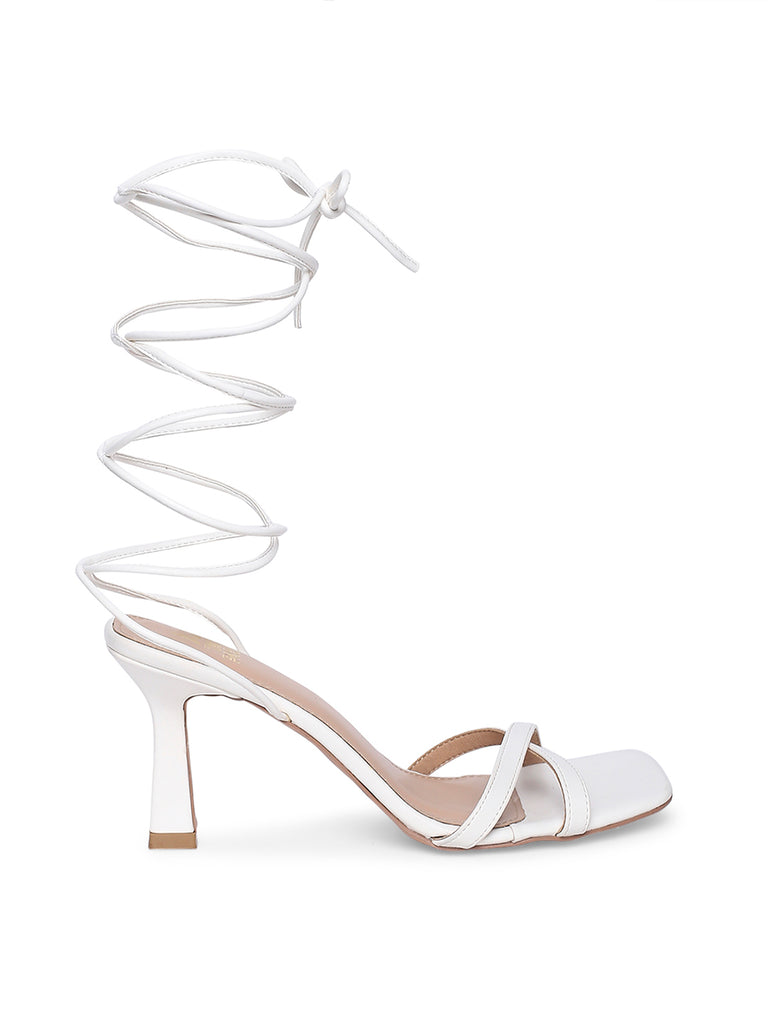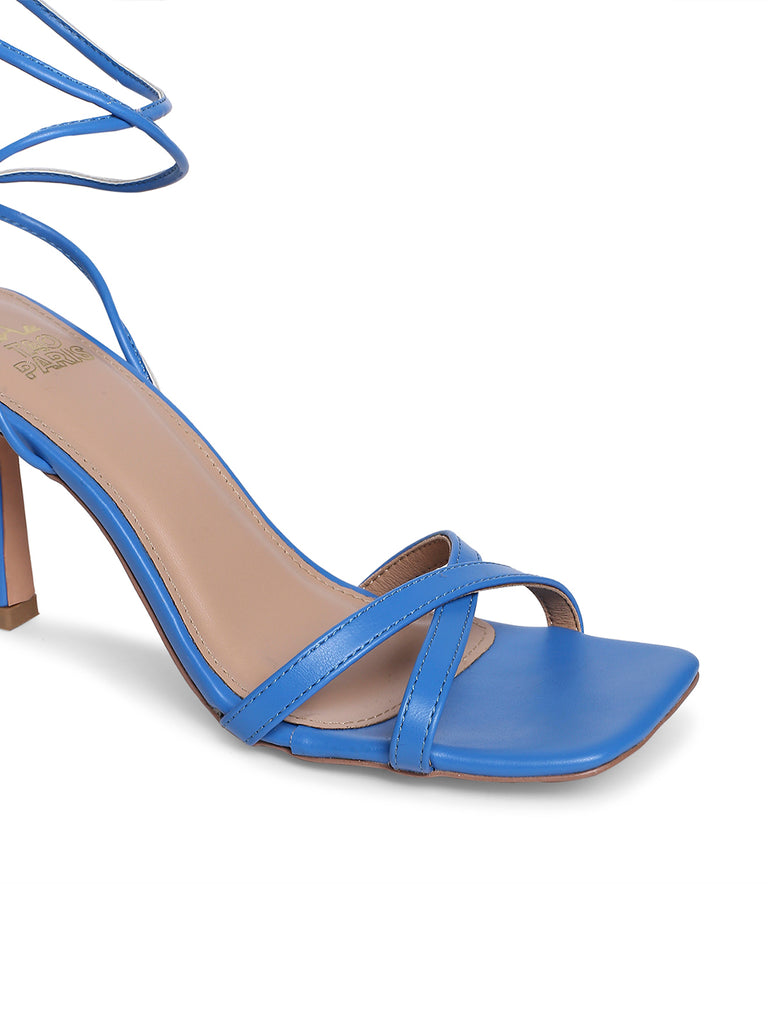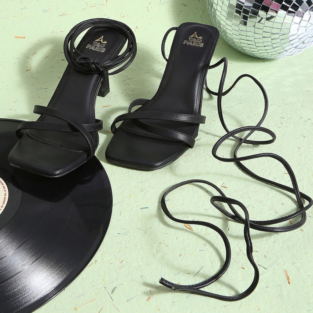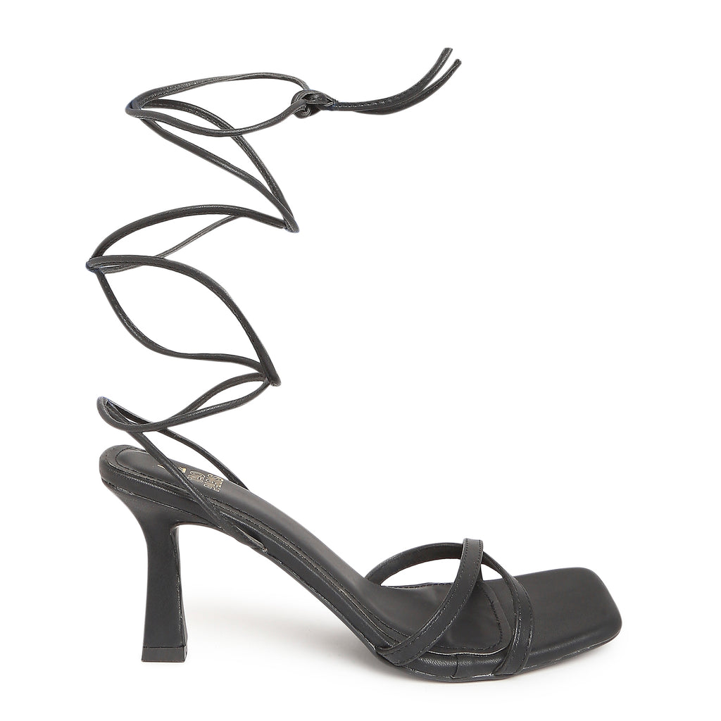 Tessa, The gorgeous pair that amalgamates our two favorite footwear trends of all time- stilettoes and long wrap-around ankle straps; the Tessa are classic heels that you need in your life! Accentuated with a square-toed front, this pair is best worn with Short dresses and capris.