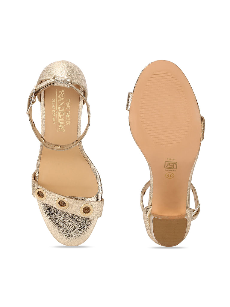 Shine in style with our Gold Genuine Leather Footwear, featuring eyelet detailing and an adjustable ankle strap. The comfortable block heel and soft cushioned padded insole ensure ease throughout the day, backed by a 3-month warranty. Designed by celebrity fashion designer Seema K Sajdeh, this collection offers a perfect blend of luxury and practicality.