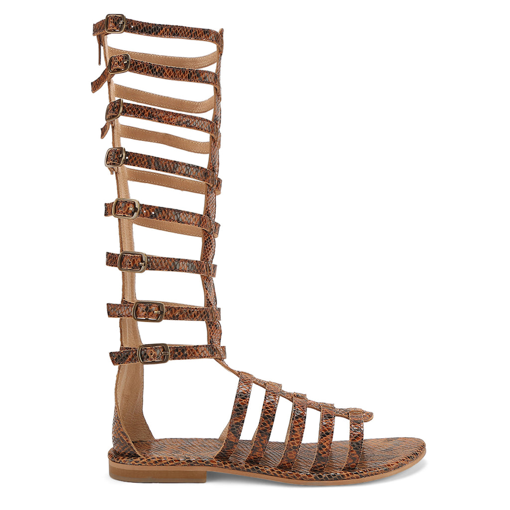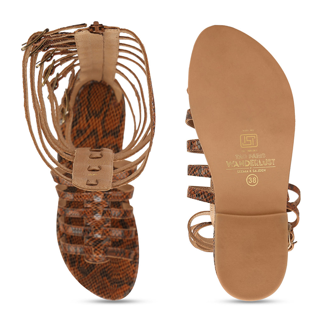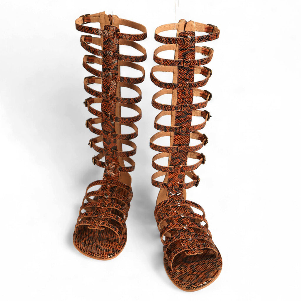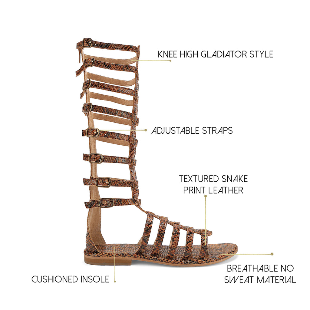 Make a bold statement with our Textured Snake Print Leather Footwear, featuring a knee-high gladiator style with adjustable straps and a breathable, no-sweat material. Designed by celebrity fashion designer Seema K Sajdeh, this collection combines cutting-edge style with comfort, including a cushioned insole and a 3-month warranty for durability and ease.