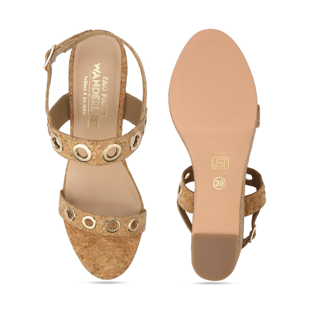 Discover the charm of our Natural Cork Upper Footwear, featuring eyelet detailing and a comfortable wedge heel. The soft cushioned padded insock ensures all-day comfort, while the collection, designed by celebrity fashion designer Seema K Sajdeh, brings together sophistication and practical elegance.