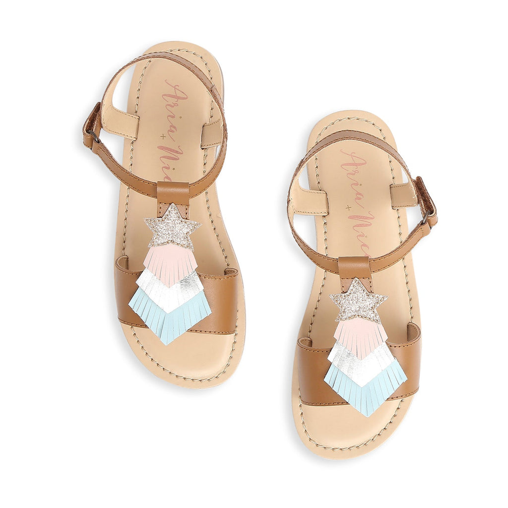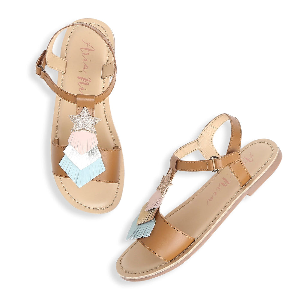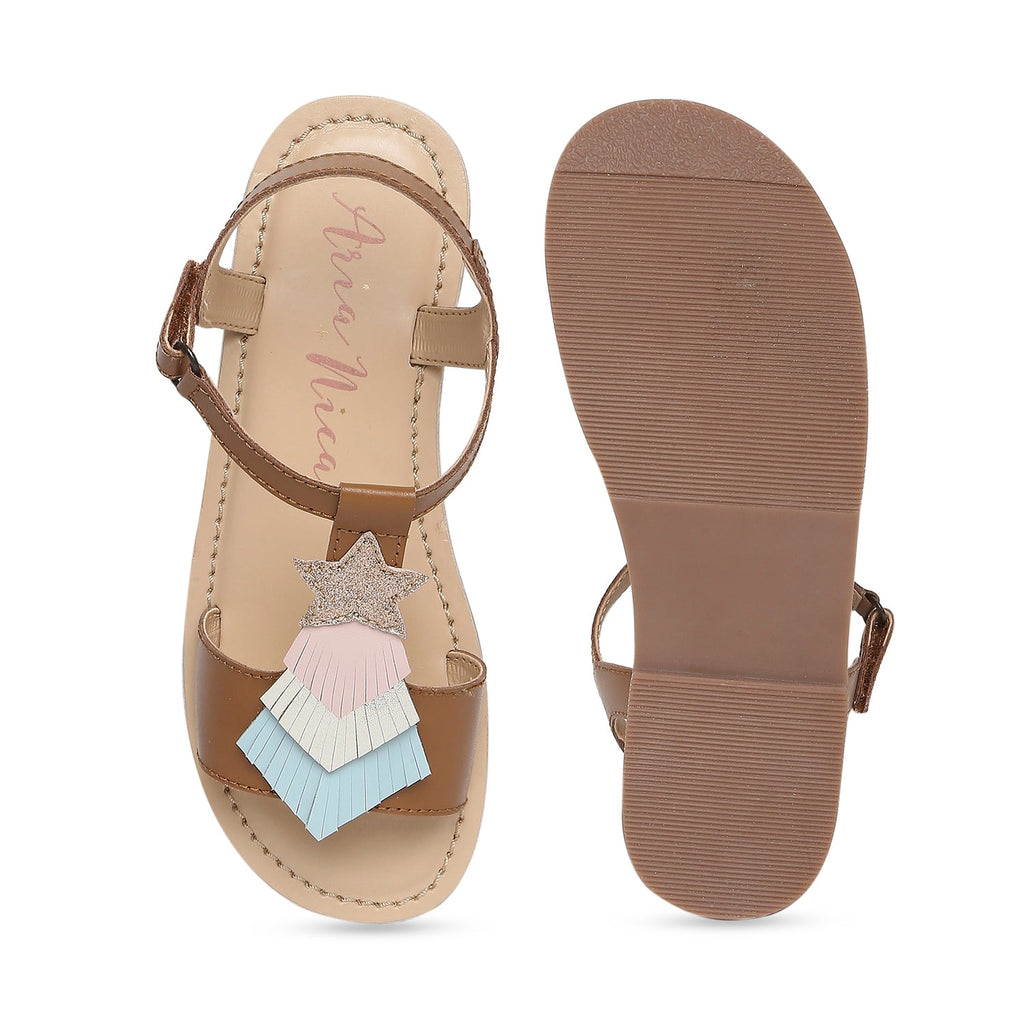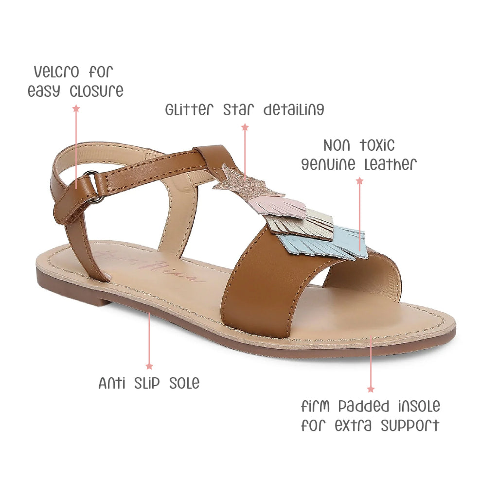 Your mini hipster has a personality of her own. And so does this quirky pair. Available in Tan, the tassled straps give a nomadic vibe to an otherwise good-girl style. Kidsfootwear + girlssandal + tan + for your little girl