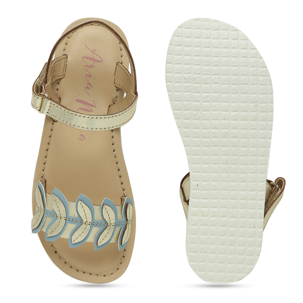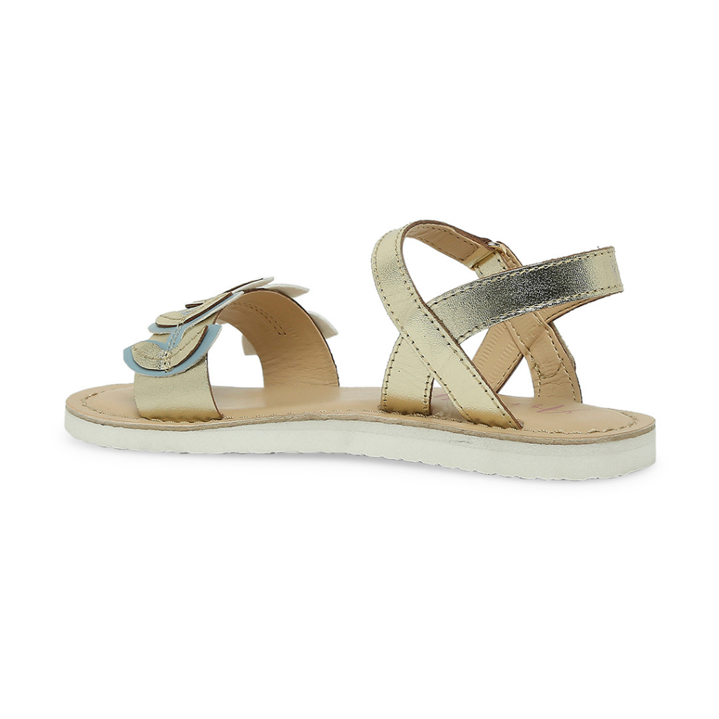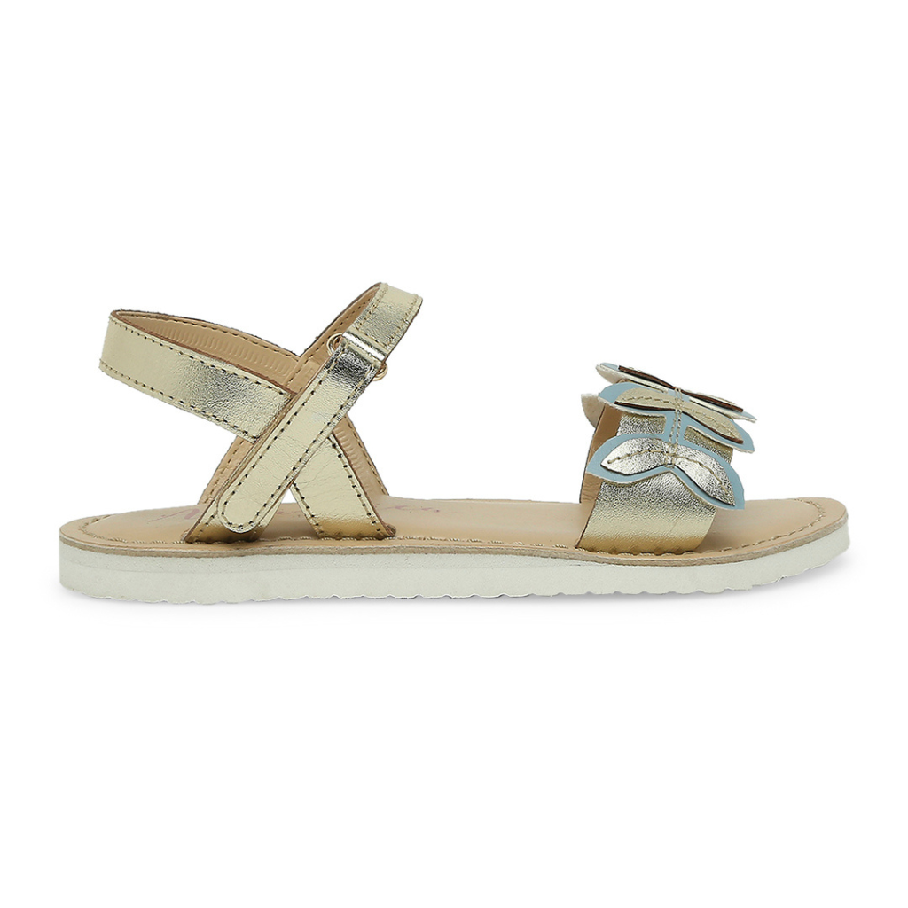 Is it time to chase butterflies yet? These strappy flats with dainty floral embellishments are asking. Available in gold. Kidsfootwear + girlssandal + gold + for your little girl