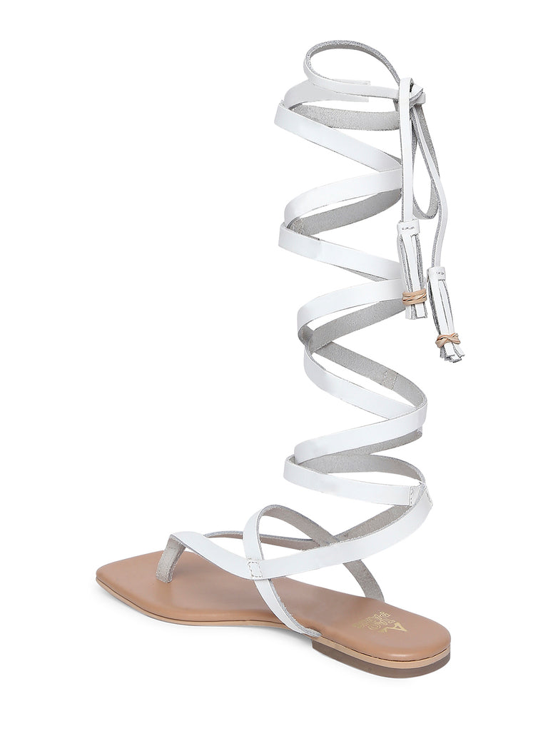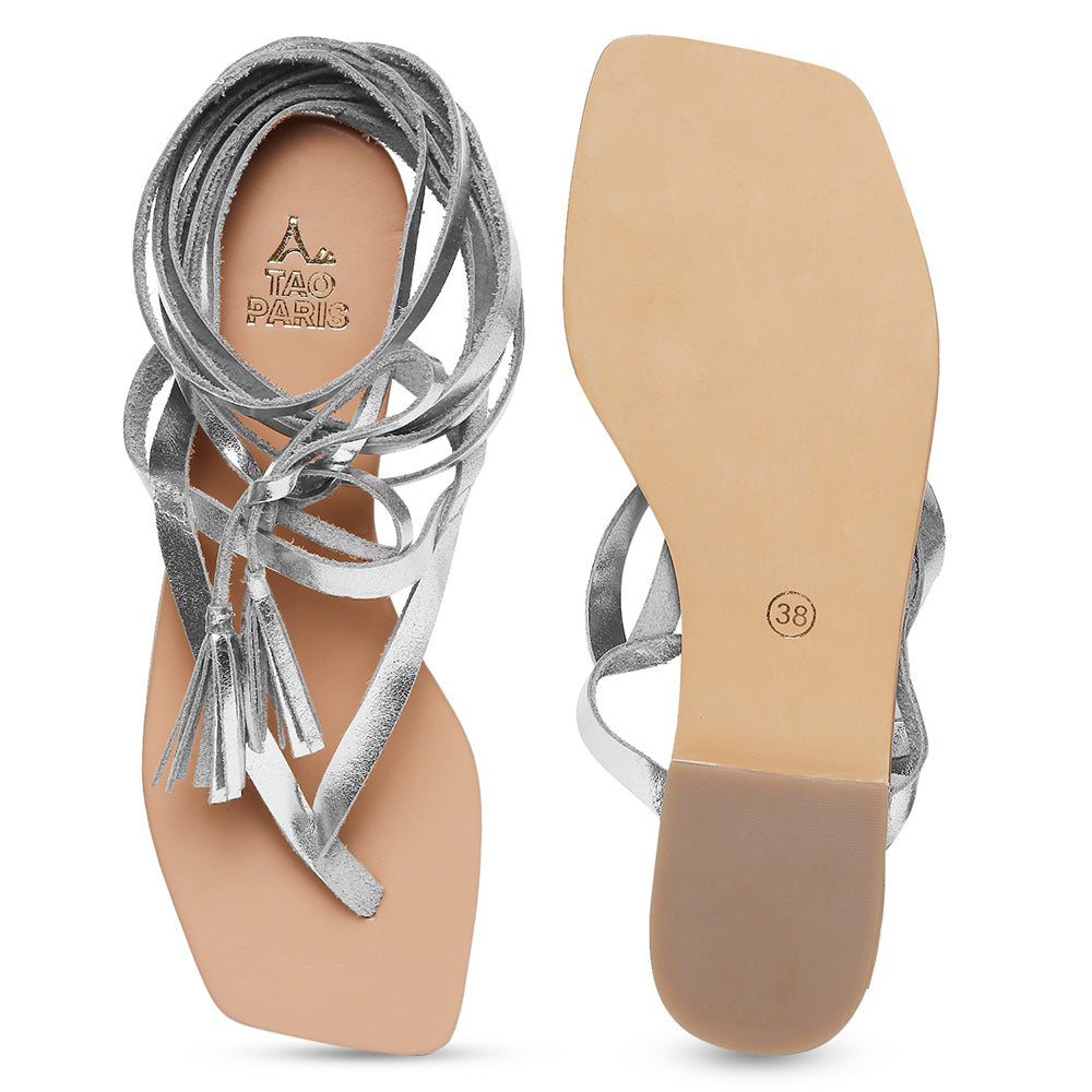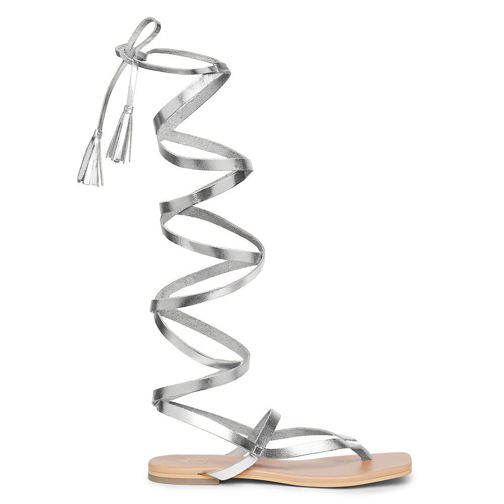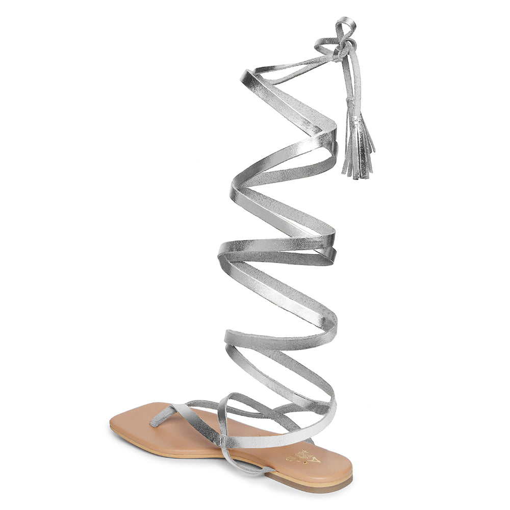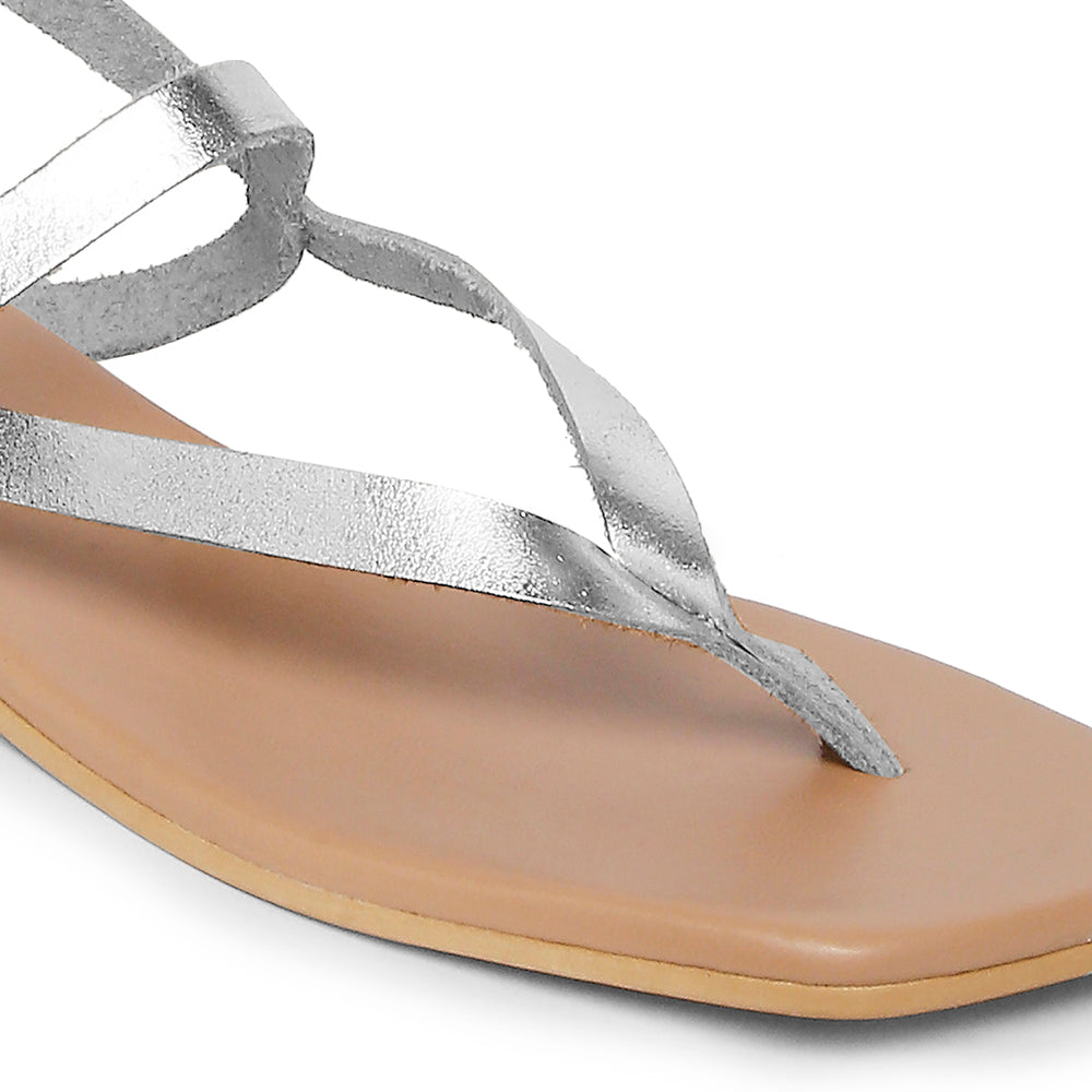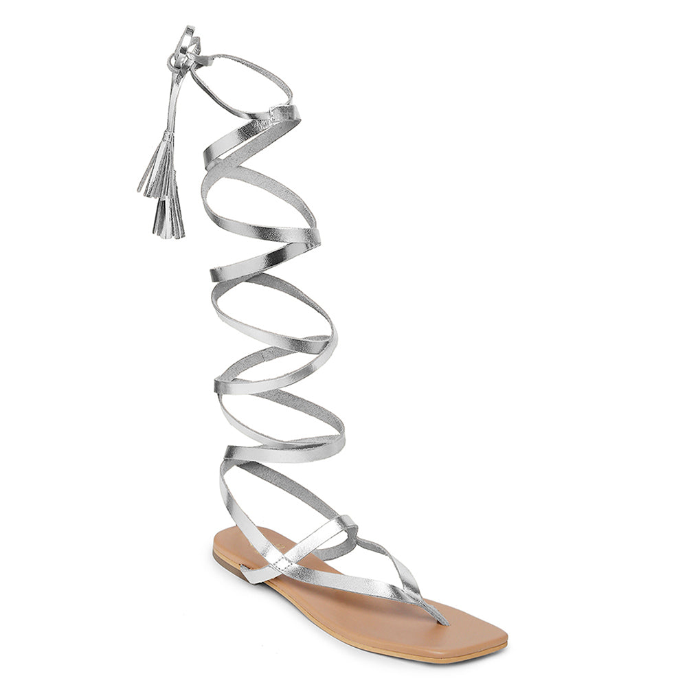 gladiators. Crafted to provide impeccable comfort, the pair has thin silver straps forming a ‘V’ over the foot that are further extended to form the ankle tie-ups